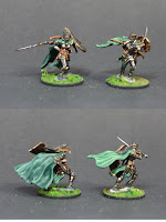These two are Pathfinder Human Female Fighters and I rather like the gal with the sword despite her bendy scabbard. The gal with the bow is not glued, sculpted, or molded particularly well and that kind of ruins it for me. She also has a really significant gluing issue on her head and cloak which looks really, really wrong. As an additional badness, her cloak has the typical difficult negative space underneath which I hate so much on these figs. I spent probably too long on these and only one of them looks OK. I did speed up over the course of the theme, so there's that.