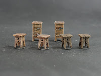These are a set of cabinets and chairs. I don't think we see this kind of cabinet super often in the west but I have it on good authority that they're common elsewhere. Across the chairs you can probably tell that I varied the undercoat which was played by two different shades of contrast paints followed by a couple washes and a couple drybrushes and no, I don't remember the particular colors. The only annoying thing about them was gluing them to their tiny magnet bases and maybe picking out the metal bits.